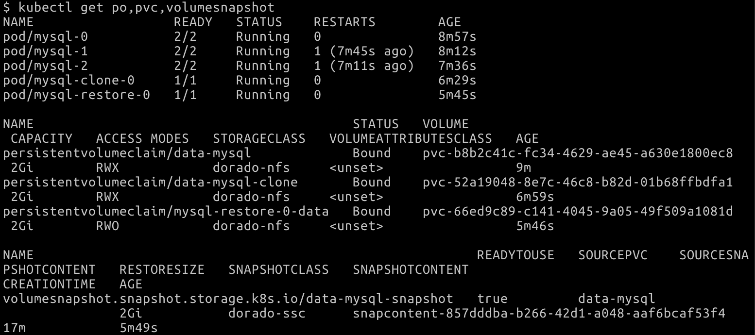 persistentvolumeclaim/mysql-restore-0-data Bound pvc-66ed9c89-c141-4045-9a05-49f509a1081d 2Gi RWO dorado-nfs <unset> 5m46s