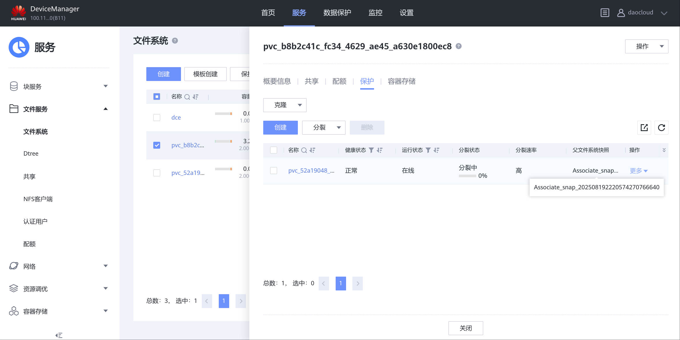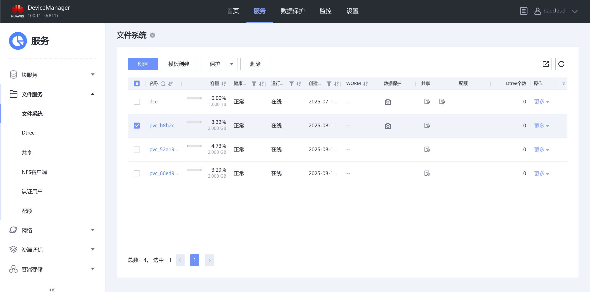 设置=>文件服务=>NFS服务,daocloud租户下,打开各个 4.x 服务 注意:CSI 会根据 mountOption 里的 NFS 版本过滤 StoragePool