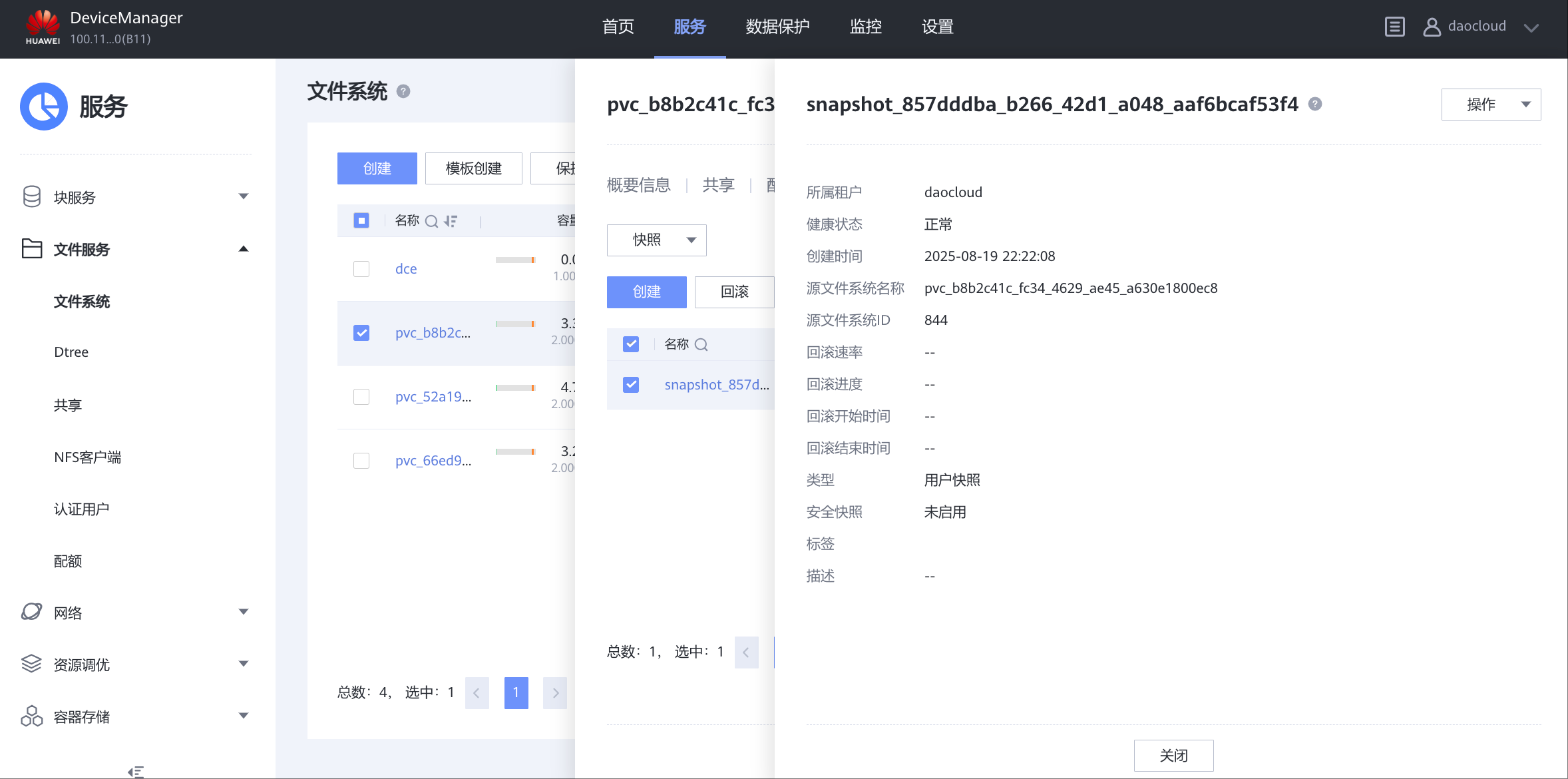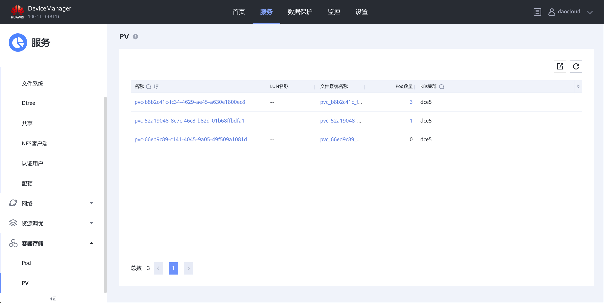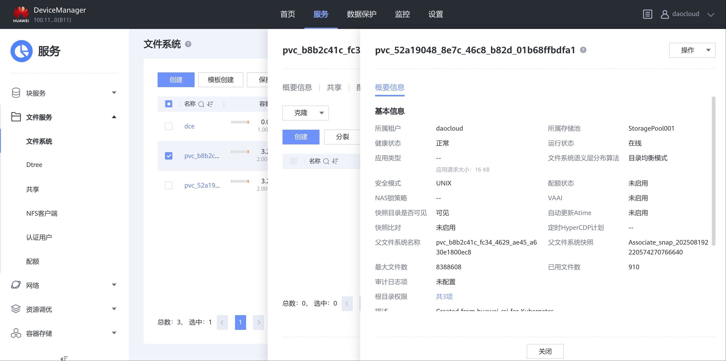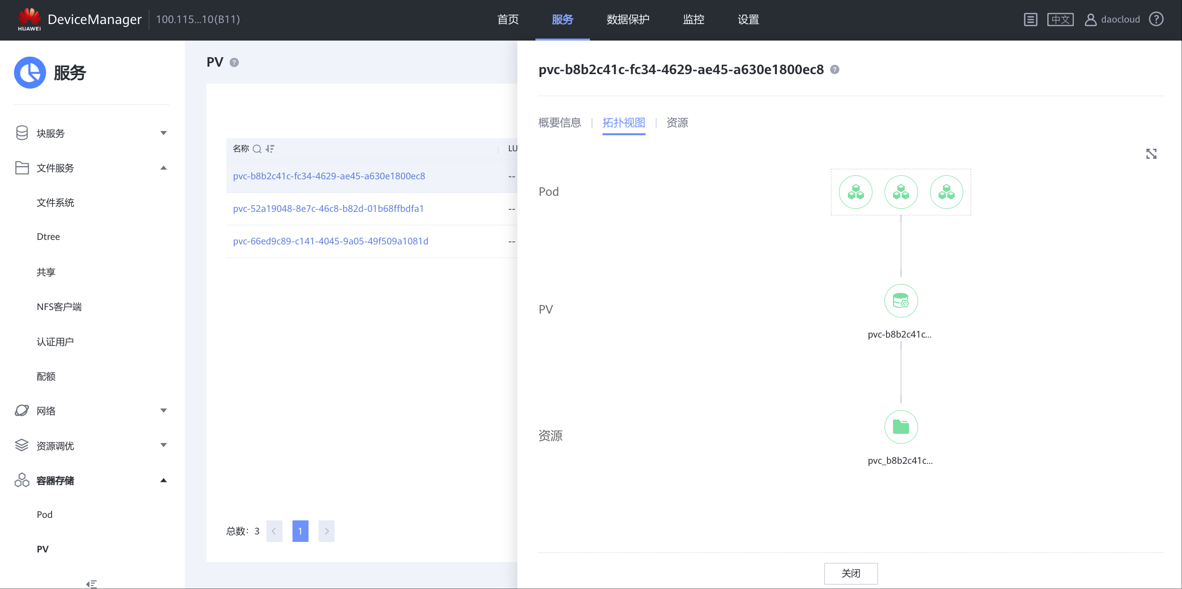 - 服=>多租户,daocloud租户=>概要信息,关联 StoragePool001;