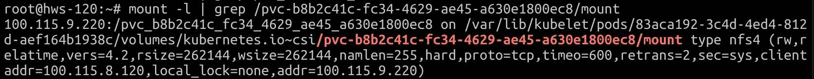 100.115.9.220:/pvc_b8b2c41c_fc34_4629_ae45_a630e1800ec8 on /var/lib/kubelet/pods/83aca192-3c4d-4ed4-812d-aef164b1938c/volumes/kubernetes.io~csi/pvc-b8b2c41c-fc34-4629-ae45-a630e1800ec8/mount type nfs4 (rw,relatime,vers=4.2,rsize=262144,wsize=262144,namlen=255,hard,proto=tcp,timeo=600,retrans=2,sec=sys,clientaddr=100.115.8.120,local_lock=none,addr=100.115.9.220)
